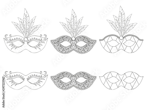 Fototapeta premium Collection of hand drawn masks. Isolated on white. Mardi gras. Black and white. Vector illustration.