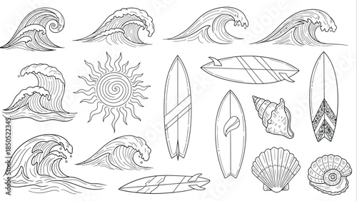 Fototapeta premium Collection of Hand Drawn Ocean Waves Surfboards Seashells and Sun Elements.