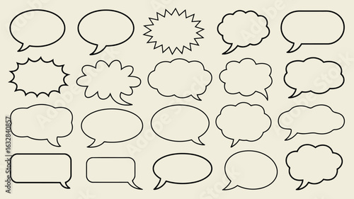 Fototapeta premium Collection of hand drawn speech bubbles and comic thought clouds, simple outline set for dialogue, messages, and text design