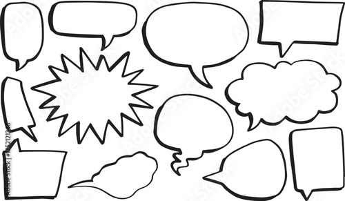 Fototapeta premium Collection of Hand-Drawn Speech Bubbles and Dialogue for Comic Strips, Social Media, and Web Design, Offering Various Shapes and Styles for Creative Communication