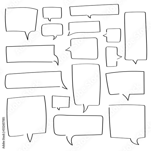 Obraz premium Collection of hand drawn square speech bubbles. Big and small doodle chat clouds. Dialogue, discussion, message, reply sketch on white background