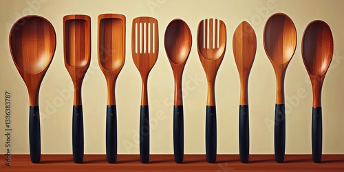 Fototapeta premium Collection of handcrafted wooden kitchen utensils displayed on a wooden...