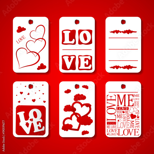 Fototapeta premium Collection of Happy Valentines day gift tags. Set of hand drawn holiday label in white and red. Romantic badge design