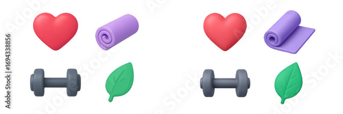Fototapeta premium Collection of heart, yoga mat, dumbbell, and green leaf symbols for health, fitness, and natural well-being