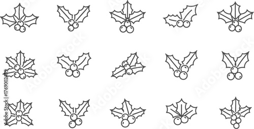 © Farzana, Fototapeta premium Collection of holly leaf and berry line art icons in minimalist design