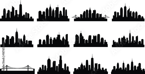 Naklejka premium Collection of iconic city skyline silhouettes and bridge outlines, black urban landscape illustrations, perfect for architecture, travel, and city design projects