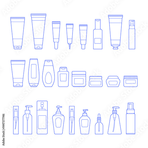 Fototapeta premium Collection of illustrations of cosmetics packaging in outline style
