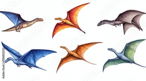 Fototapeta premium Collection of Isolated Pterodactyls on White Background