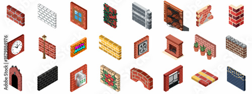 Fototapeta premium Collection of isometric brick wall elements and constructions, featuring...