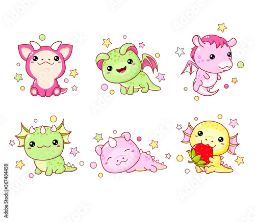 Obraz premium Collection of kawaii little dragons in various poses