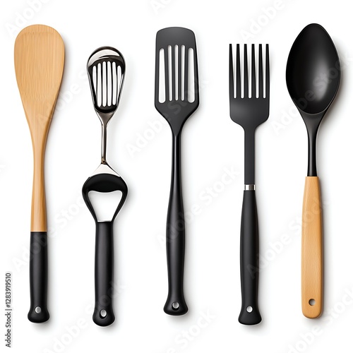 © สนิท เกษแก้ว, Fototapeta premium Collection of Kitchen Utensils Including Wooden Spoon, Slotted Spoon, Spatula, Serving Fork, and Ladle