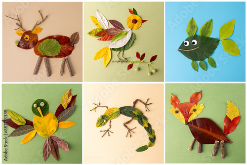 Fototapeta premium Collection of leaf art creations depicting animals crafted from natural materials. deer, bird, fish, bird. These artworks showcase creativity using natural elements highlighting the beauty of nature,