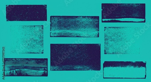 © AbdulBasit, Fototapeta premium Collection of linocut rectangle textures with ink roller effects on a bright neon turquoise background. Vintage letterpress overlays with rough edges for urban and street art designs.