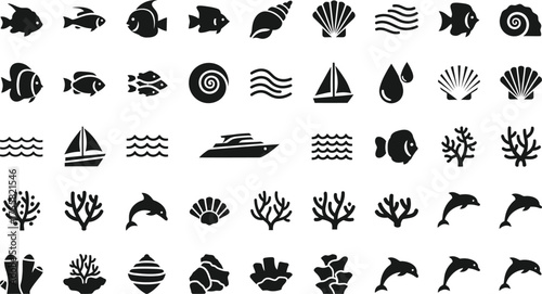 Naklejka premium Collection of marine life and nautical icons including fish shells coral...