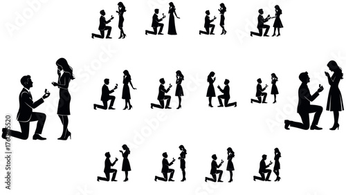 Naklejka premium Collection of Marriage Proposal Silhouettes: Man Kneeling to Woman, Engagement Ring, Wedding Planning, Relationship Milestones, Diverse Couples Vector Set