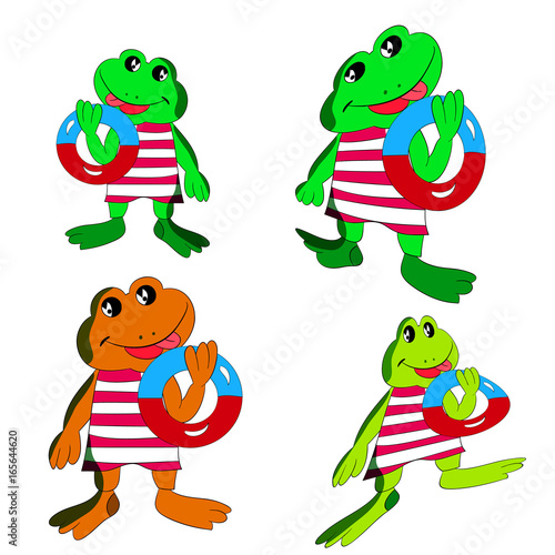Obraz premium Collection of merry frogs with a bathing circle in the hand, cartoon on a...