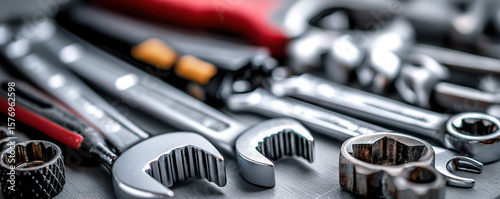 Fototapeta premium Collection of metal tools arranged neatly on a workbench for repair and...