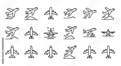 Naklejka premium Collection of minimalist airplane icons depicting takeoff landing and flight concepts featuring simple black line drawings on a white background