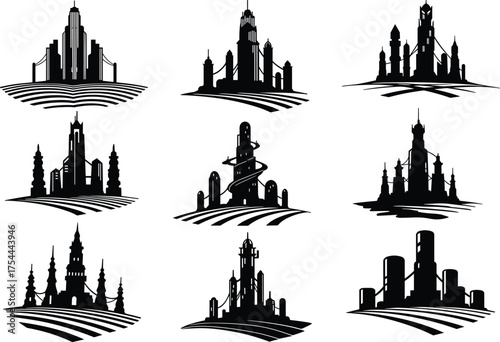 © Afsana Creatives, Obraz premium Collection of modern and futuristic city skyline silhouette vector illustrations for architecture, urban landscape, real estate, and metropolitan design concepts