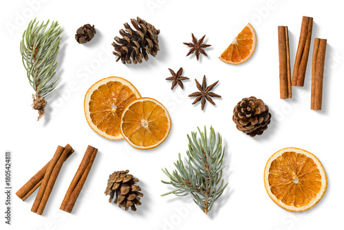 Obraz premium Collection of natural winter and Christmas elements, including dried orange...