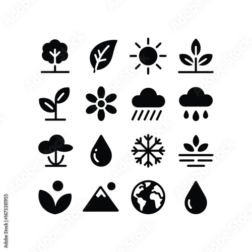 Fototapeta premium Collection of nature and weather icons representing trees plants sun rain snow and earth elements