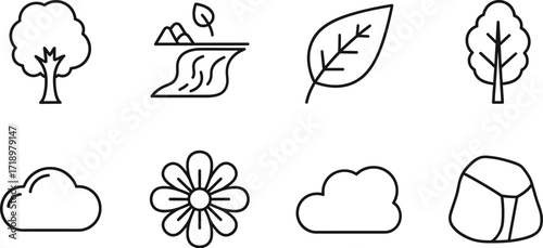 © Farzana, Obraz premium Collection of nature icons featuring a tree, waterfall, leaf, flower, cloud, and stone