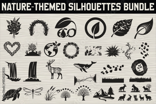 © Amazinart, Fototapeta premium collection of nature-themed silhouettes featuring mountains, forests, wildlife, trees, and outdoor adventure elements