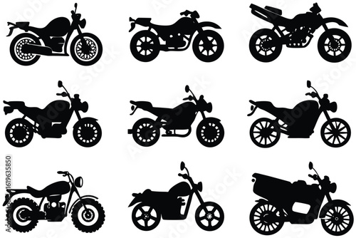 Obraz premium Collection of nine black motorcycle silhouettes on a white background