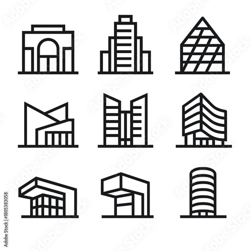 © Fora, Fototapeta premium Collection of nine modern architectural building icons in minimalist line art style