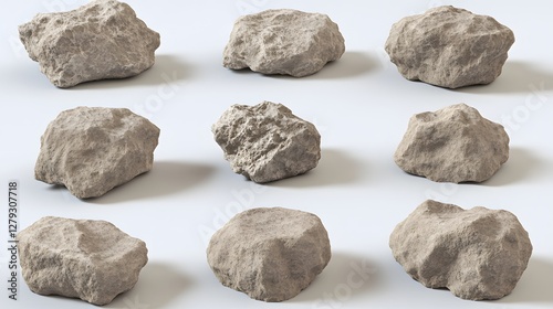 © wannakorn, Naklejka premium Collection of Nine Rough Gray Rocks Stones Minerals Isolated on White Backdrop for Geological Study
