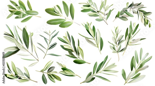 Naklejka premium Collection of Olive Branches in Various Poses Isolated on White Background....