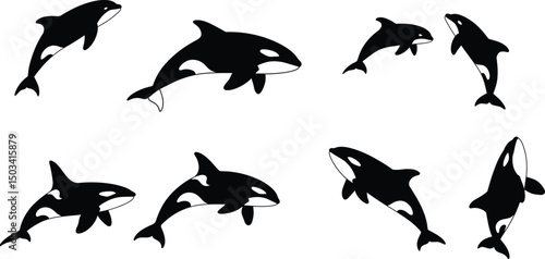 Fototapeta premium Collection of Orca (Killer Whale) Illustrations: Marine Mammals with Markings in Various Poses. Sea Life Vector Set. AI Generative