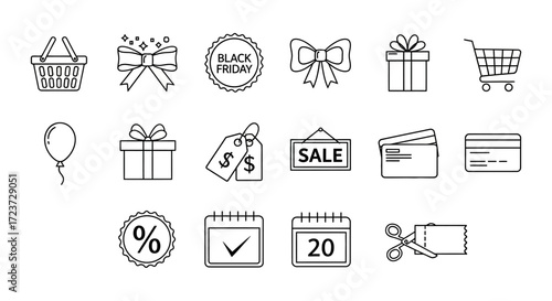 Naklejka premium Collection of outline icons related to shopping, sales, and special events, perfect for design.