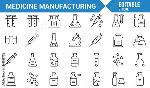 © SAKINA, Naklejka premium Collection of Pharmaceutical Manufacturing Icons for Lab Research, Medicine, and Healthcare Design