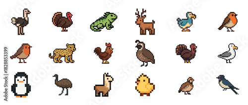 Obraz premium Collection of pixel art animals: birds, mammals, and reptiles in retro style