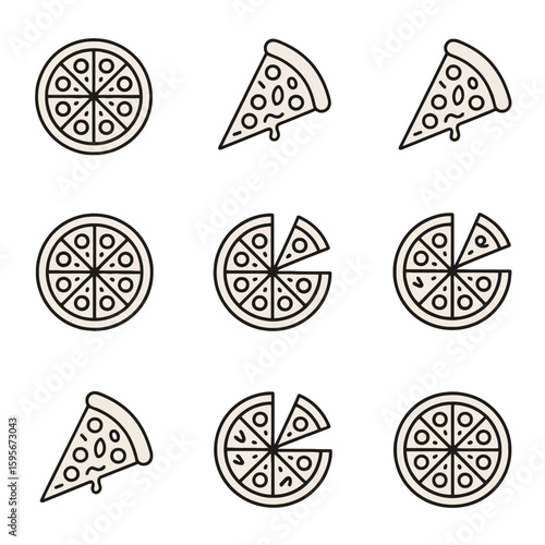 © Nur alam, Naklejka premium Collection of pizza slices and whole pizzas in outline style isolated on white background