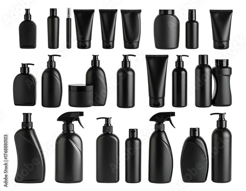 © Jig, Fototapeta premium Collection of plain black cosmetic bottles and tubes of various sizes and shapes, arranged neatly