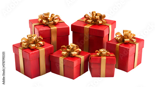 © AN STOCK, Obraz premium Collection of red gift boxes with golden bows isolated on white background