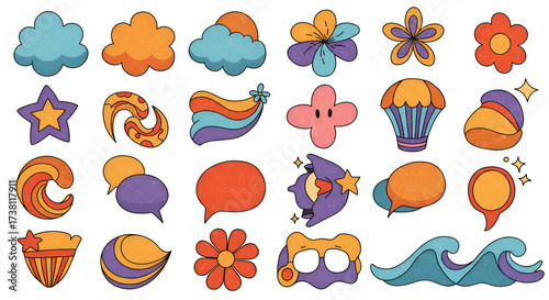 © Hendrik, Fototapeta premium Collection of Retro-Styled Vector Graphics: Clouds, Flowers, Waves and Abstract Shapes