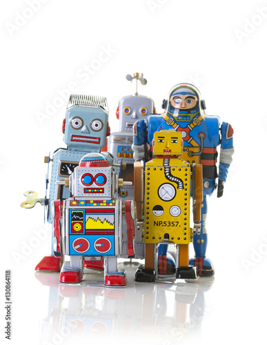 © Jon Le-Bon, Fototapeta premium Collection of Retro Tin Clockwork Robots on a White Background