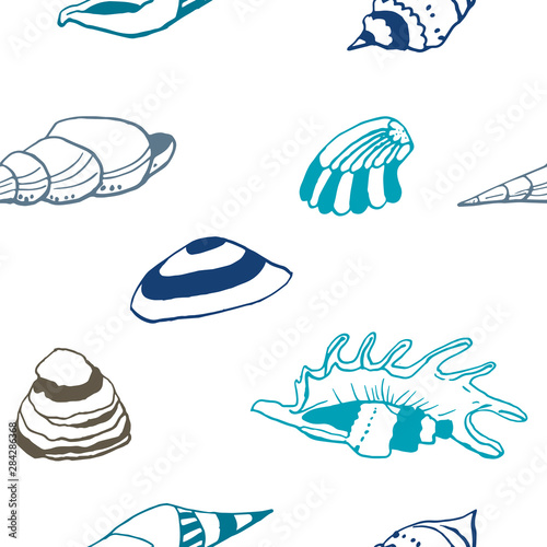 © Diana, Naklejka premium Collection of sea shell ink doodles on white backdrop. Seamless pattern. Endless texture. Can be used for printed materials. Underwater holiday background. Hand drawn design elements. Sea life print.