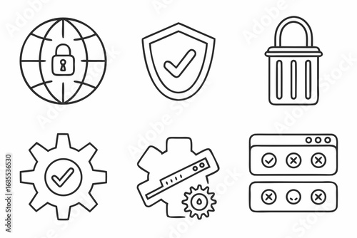 © Stock, Fototapeta premium Collection of security and technology icons including a locked globe shield with checkmark padlock gears and login interface