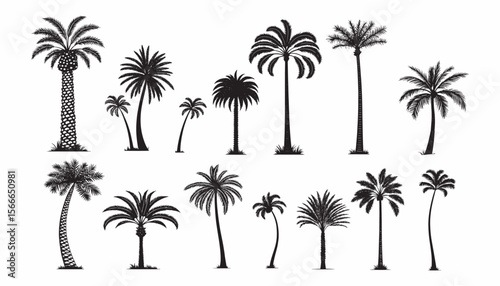 Fototapeta premium Collection of 14 Silhouetted Palm Trees in Varied Shapes and Sizes Tropical Flora Collection Exotic Vacation Vibes Artistic Palm Tree Variety Pack.