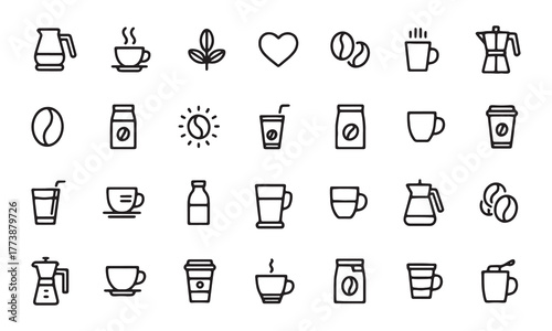 © Khorshed, Fototapeta premium Collection of simple black and white line art icons representing various coffee related items and beverages for design