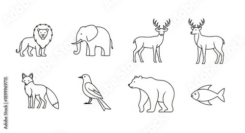 Fototapeta premium Collection of simple line art illustrations depicting various wild animals