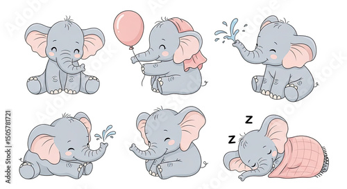 Fototapeta premium Collection of six charming cartoon elephants with gray bodies pink ears and...