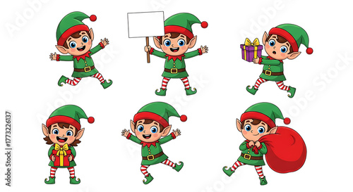 Naklejka premium Collection of six cute cartoon elves in green outfits and red hats, isolated...