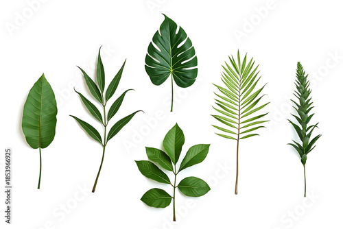 © Md Atikue Rahman, Fototapeta premium Collection of Six Diverse Green Leaves Isolated on a Clean White Background, Botanical Variety and Design Elements