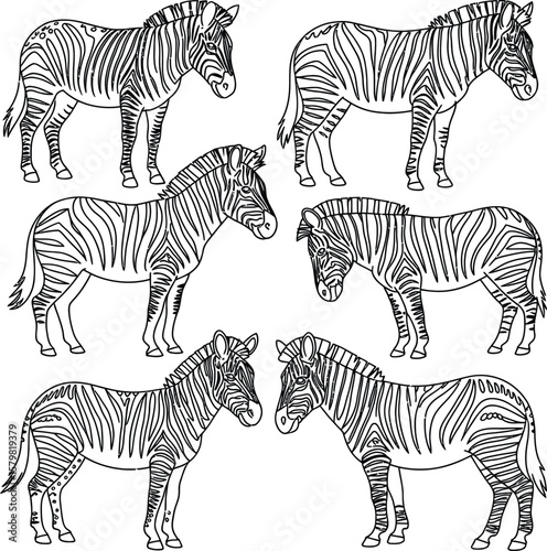 Obraz premium Collection of six stylized black and white zebra illustrations on white...