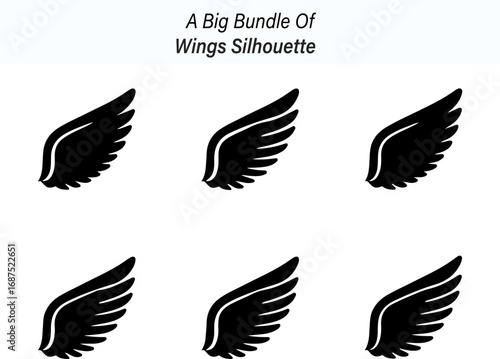 Fototapeta premium Collection of Six Stylized Wings in Black Silhouette Against a White Background silhouette This image